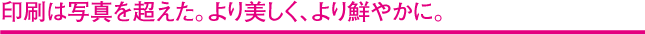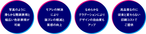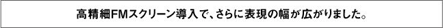 ![]() ・ 鮮やかな色彩表現が求められる写真集やポスターなど。 ・ 光沢感が求められる宝飾品や、金属感が求められるオーディオ機器などの製品カタログなど。 ・ モアレが出やすい服飾ツールなど。 ・ 細かい表現を求められる地図など。
